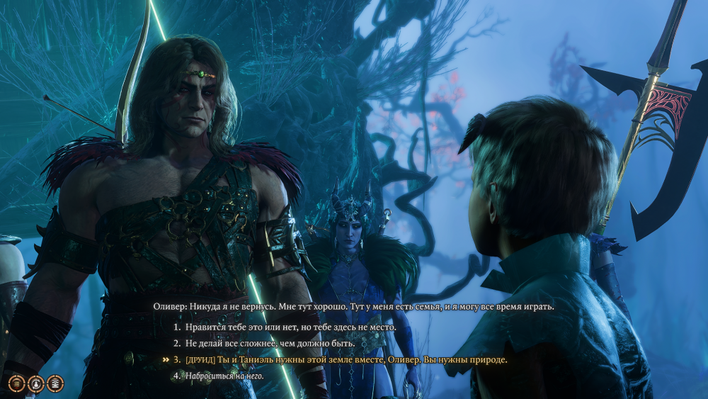 Я попробовала поговорить с Оливером Хальсином, но у него была только реплика для друида, а всё остальное - то же самое.( Но зато я заценила уникальный диалог Хальсина с Джахейрой.